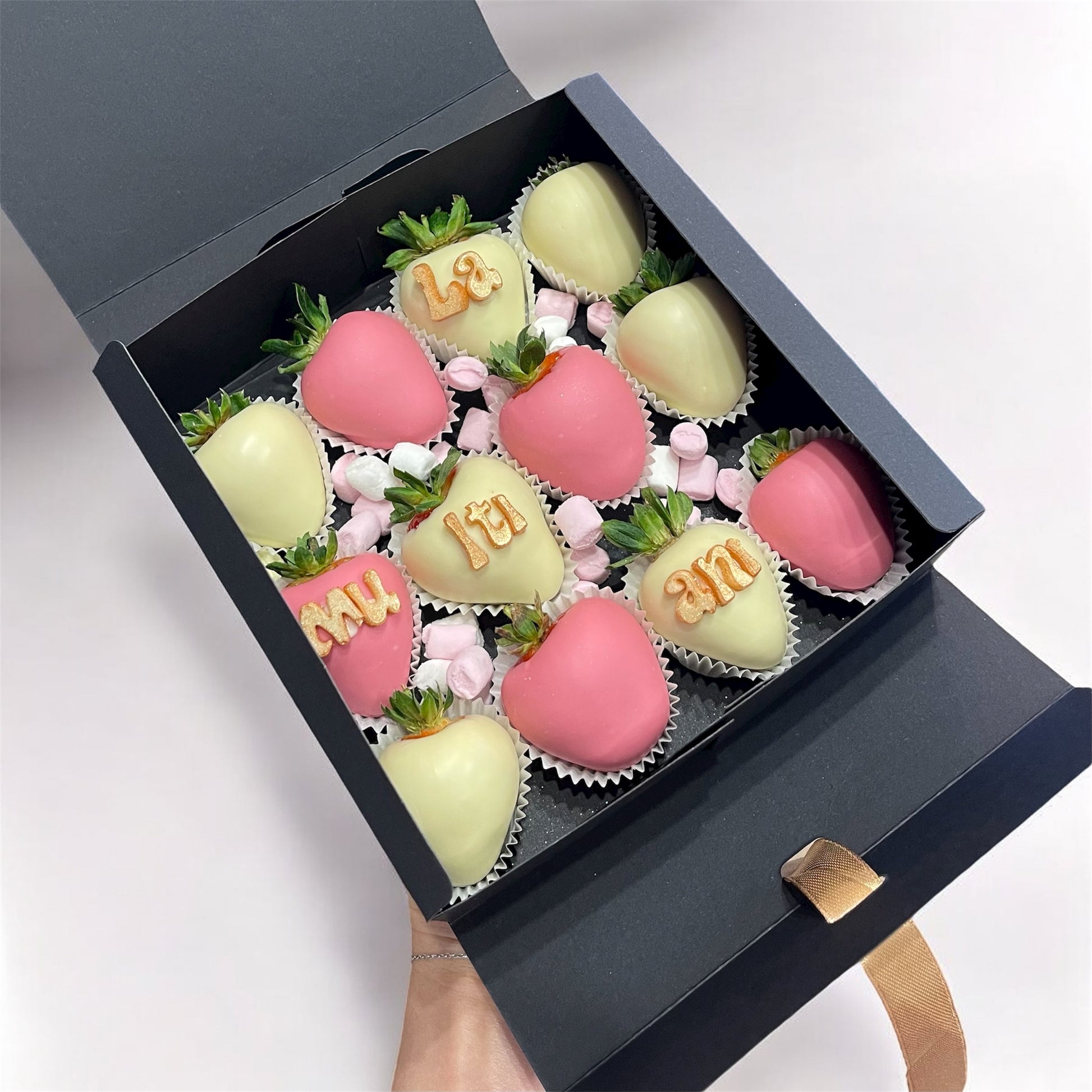 Personalizeaza-ti box-ul cu un mesaj din litere de ciocolata si alege din culorile diverse disponibile, in functie de preferintele tale.