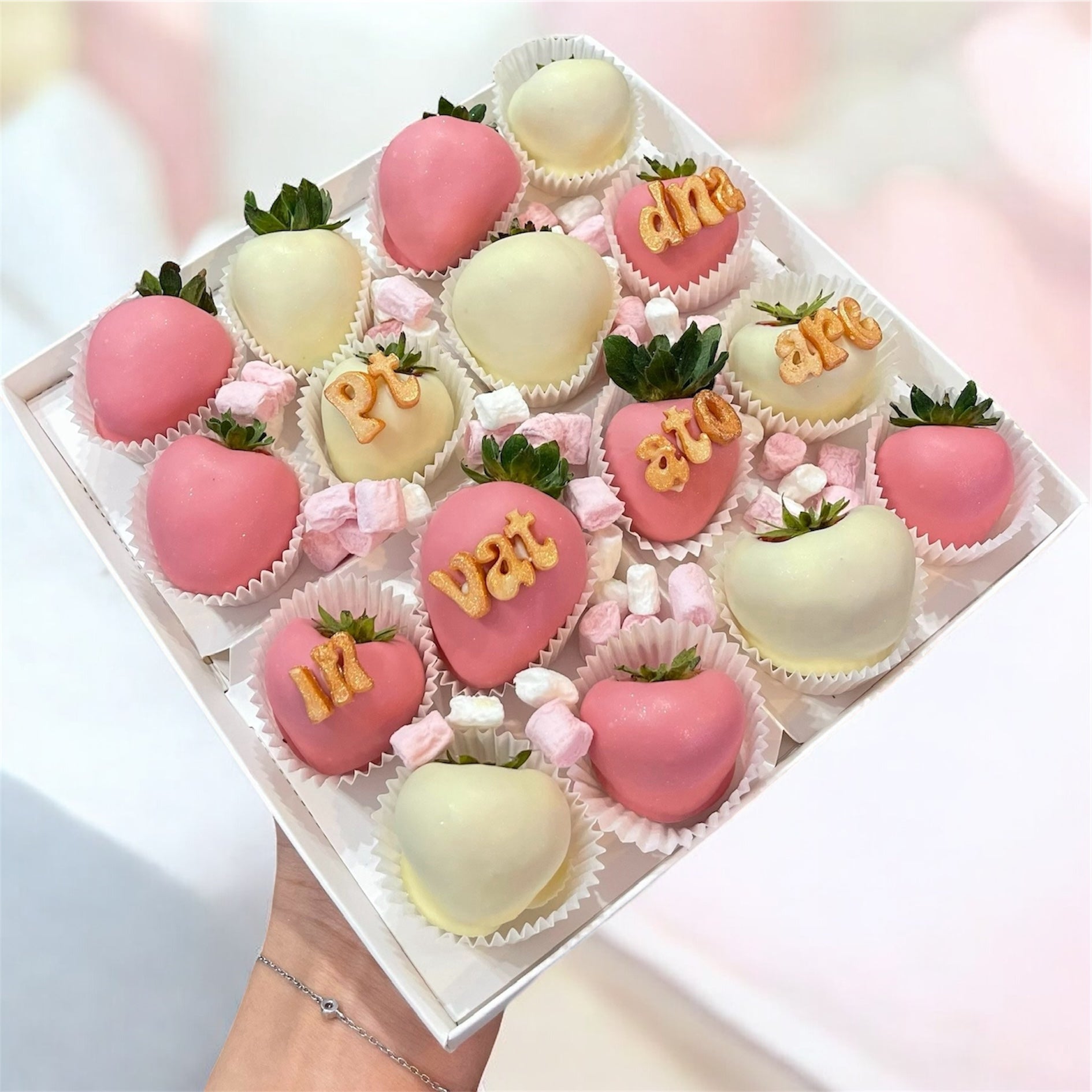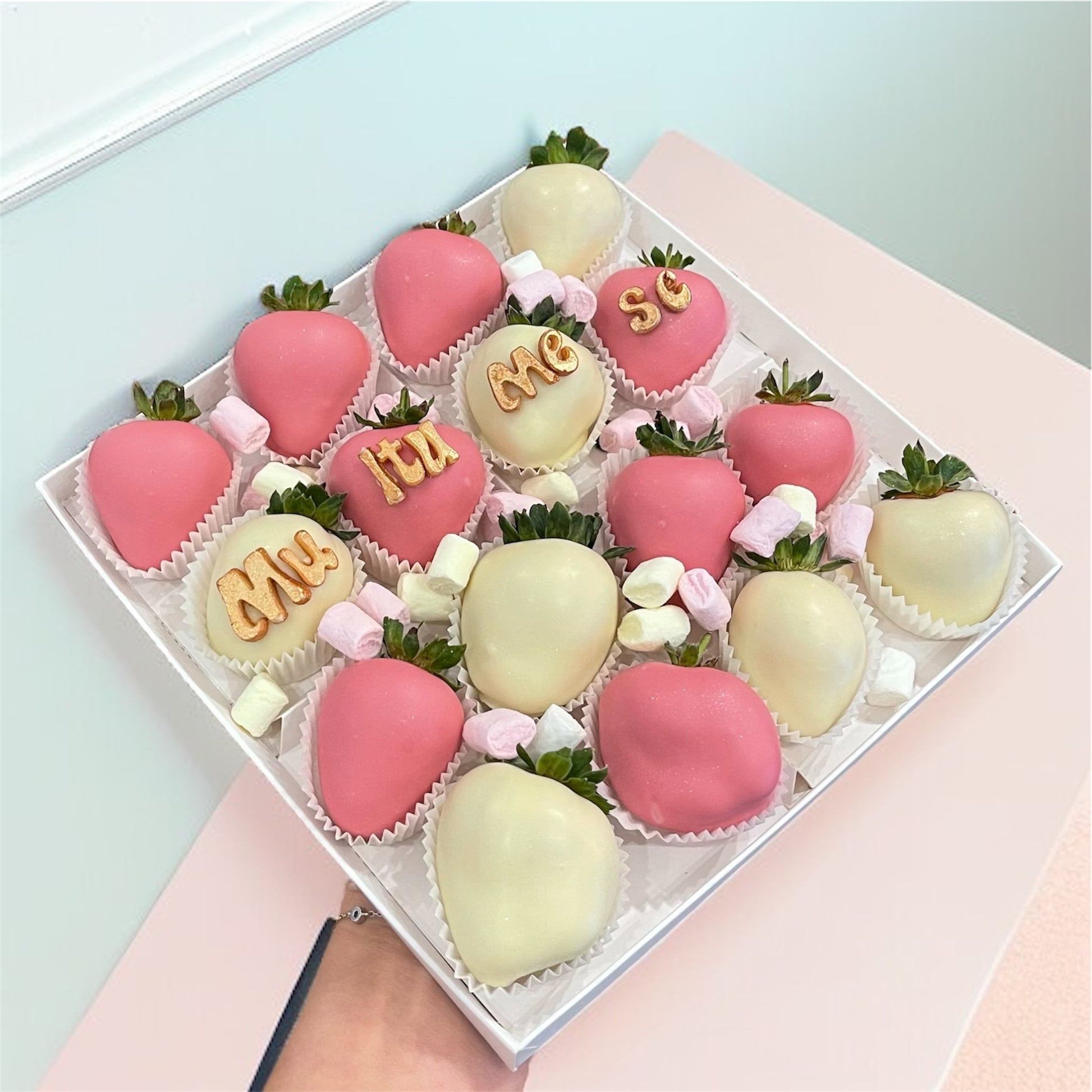 Personalizeaza-ti box-ul cu un mesaj din litere de ciocolata si alege din culorile diverse disponibile, in functie de preferintele tale.