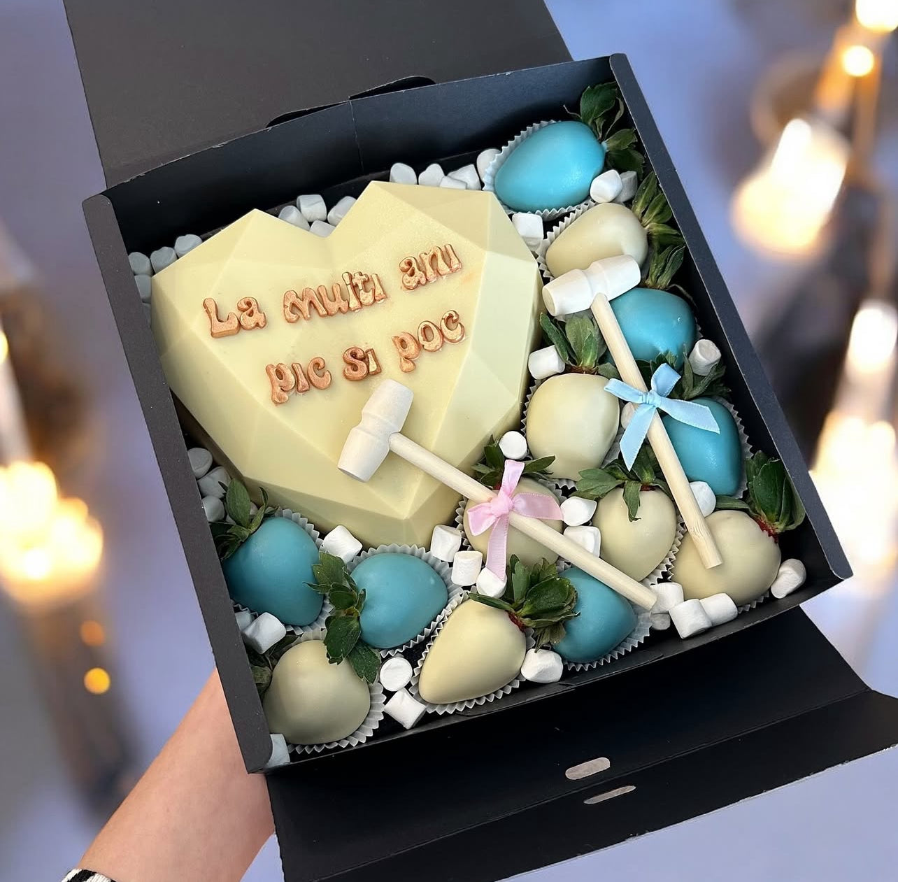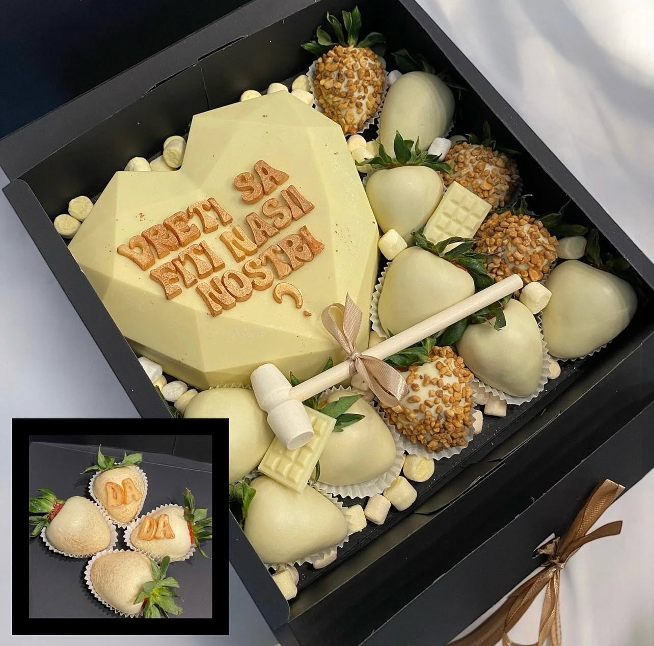 Personalizeaza-ti box-ul cu un mesaj din litere de ciocolata si alege din culorile diverse disponibile, in functie de preferintele tale.