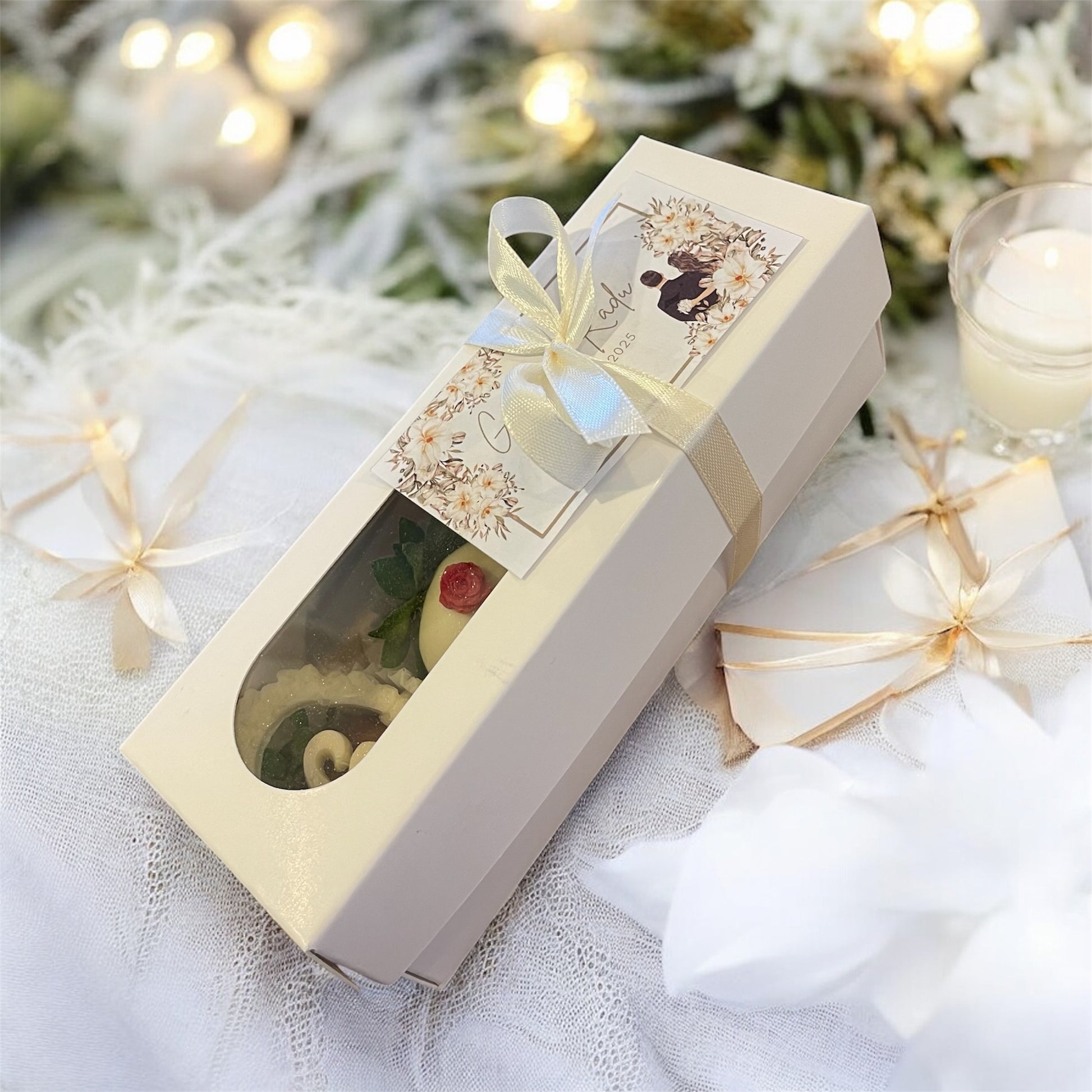 Pentru comenzi mai mari destinate evenimentelor (nuntă, botez, petreceri corporate etc.), oferim posibilitatea de a adăuga un cartonaș personalizat, cu design tematic și detalii precum numele, data, mesaj special, etc.