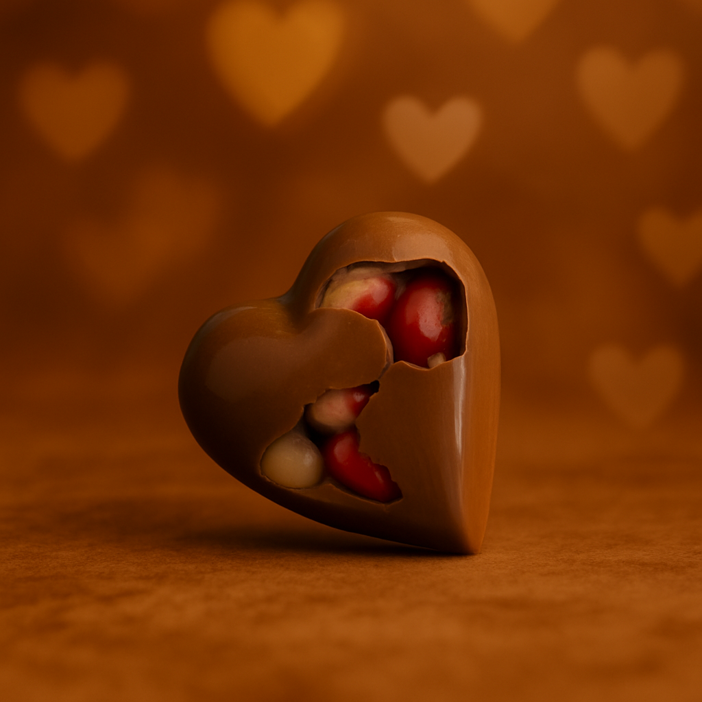Mărturie cu pralina inimă: ciocolată și rodie proaspătă. Un gest dulce, memorabil și elegant.