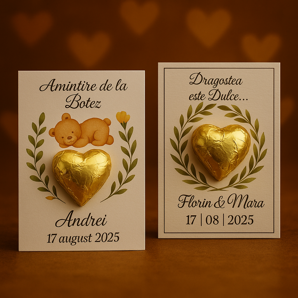 Această mărturie este realizată manual cu grijă, conținând o pralină inimioară de ciocolată fină belgiană cu lapte, umplută cu rodie proaspătă. Pralina este învelită în folie aurie premium și așezată pe un cartonaș personalizat, ideal pentru nuntă, botez sau evenimente speciale.